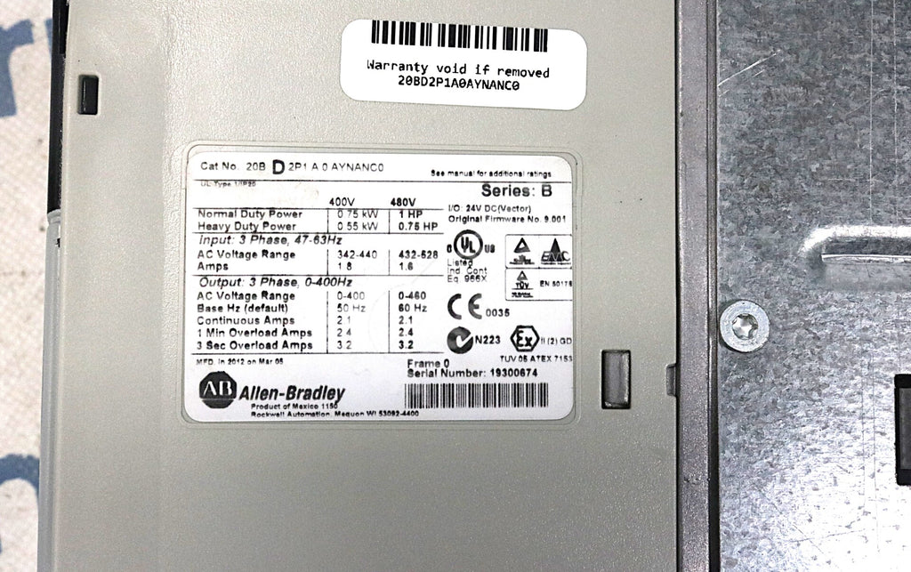 20BD2P1A0AYNANC0 By Allen Bradley 3 Phase 480V 50Hz 1HP PowerFlex 700 AC Drive |