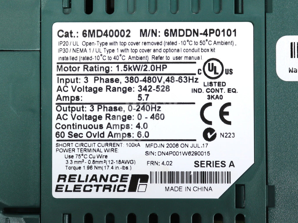 6MDDN-4P0101 By Reliance Electric 6MB4002 380-480V 3-PH 2.0HP AC Drive NSFP |
